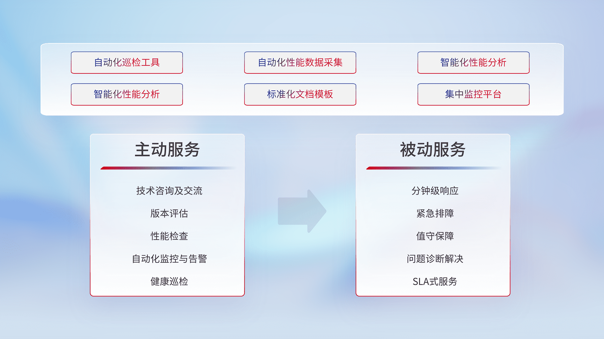 智能化工具和标准化文档,,,,保障服务质量,,,提供主动服务(包含技术咨询、、版本评估、、性能检查、、自动化监控与告警、、健康巡检)和被动服务包含(分钟级响应、、紧急排障、、值守保障、、问题诊断解决、、、SLA服务)。。